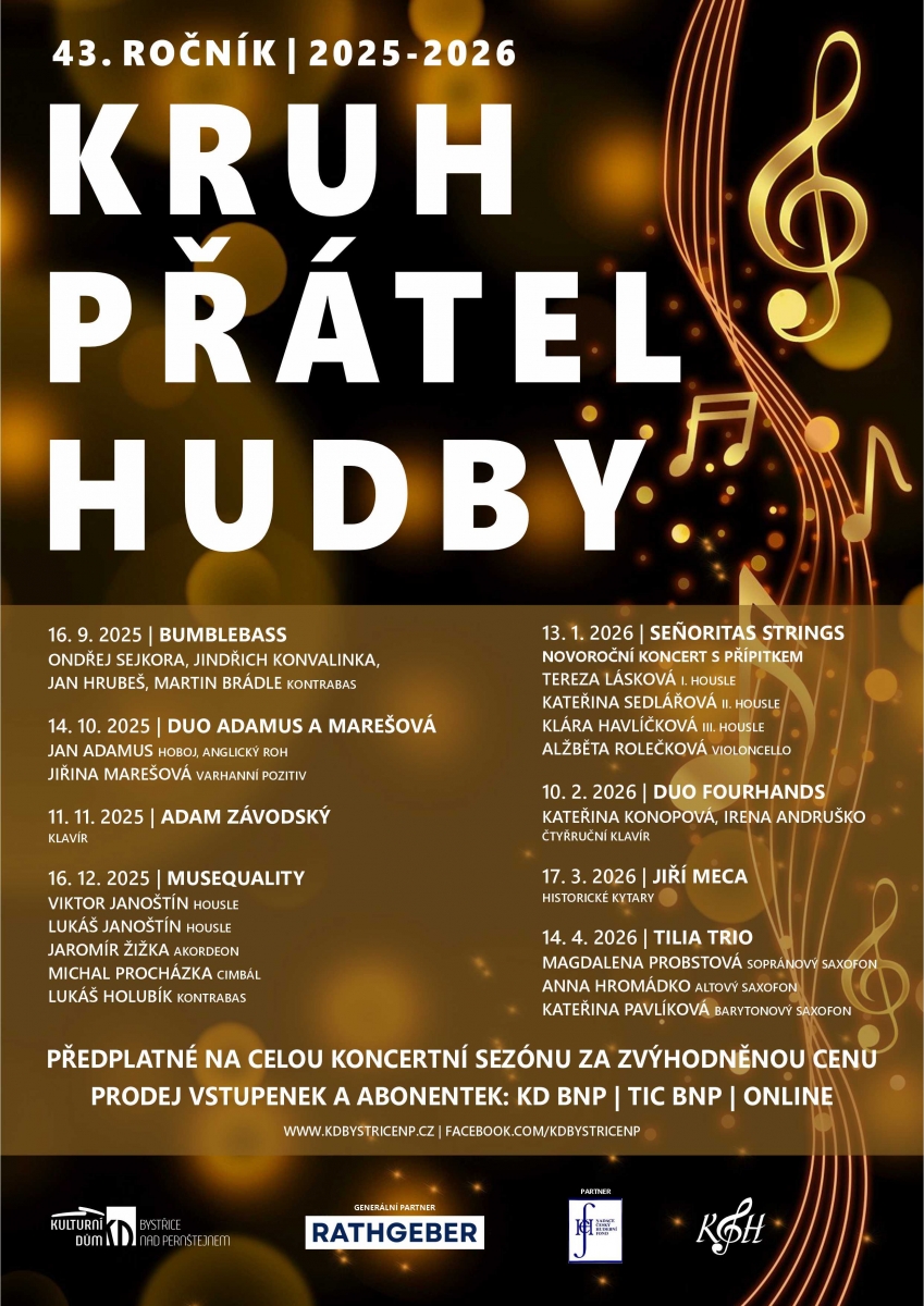 25/8/2025 Kruh přátel hudby 2025/26 Zahájen prodej předplatného na Kruh přátel hudby v sezóně 2025/26 viz níže. Informace o jednotlivých koncertech naleznete v kalendáři akcí. Aktuálně se lze… detail zprávy