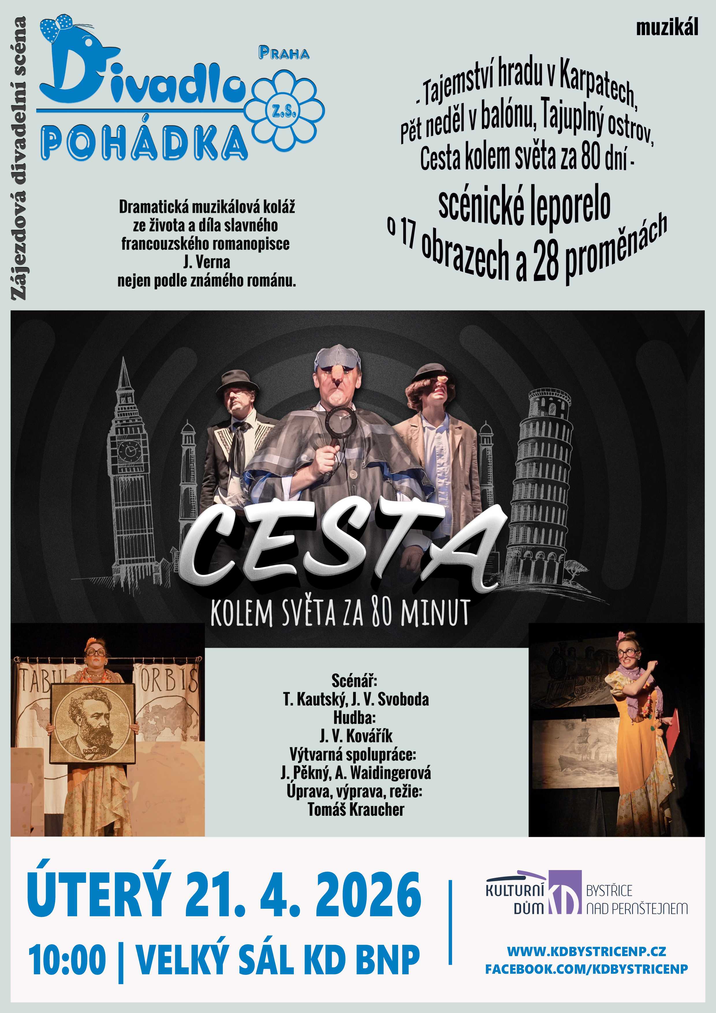 Phileas Fogg ve slavné knize Julese Verna objede celou zeměkouli za 80 dní. My si troufáme zvládnout to za pouhých 80 minut a neváháme k tomu použít všechny možné i nemožné divadelní prostředky. Takové je scénické leporelo ala hudební komedie inspirovaná životem a dílem slavného francouzského spisovatele a romanopisce o 17 obrazech a 28 proměnách.